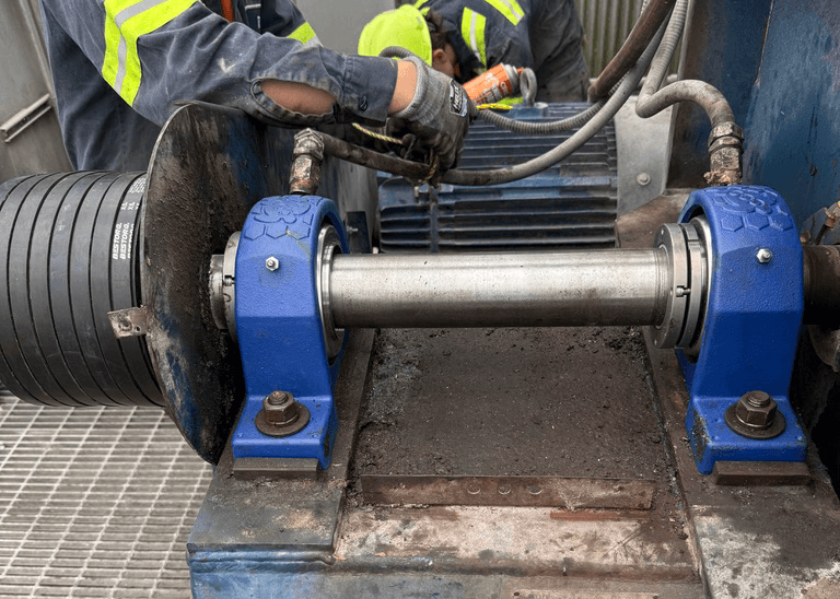 Segundo a equipe de manutenção, bastou soltar os parafusos até ouvir um “pop” do adaptador, e o rolamento saiu imediatamente do eixo.